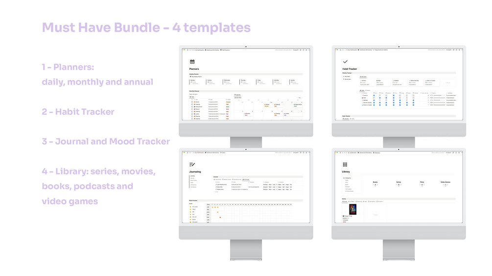 The main point of this 4 templates is to have your daily needs organized in a quick, easy and visual way. They are designed to cover the basic needs that almost everyone needs to have organized and to keep track of your processes.