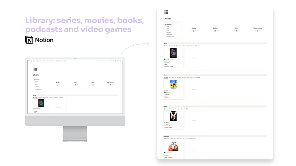 - Create a library with all your series, movies, books, podcasts and video games.